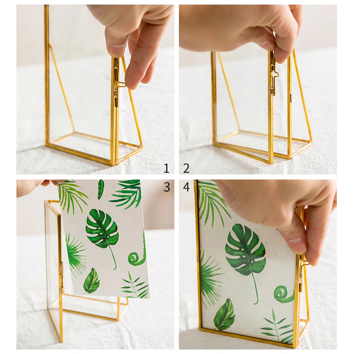 Gold-Edged Glass Display Stand: Showcase Nature's Beauty in Luxurious Elegance. Perfect for botanical arrangements, this contemporary frame blends seamlessly with any decor, enhancing indoor spaces with a touch of golden refinement.