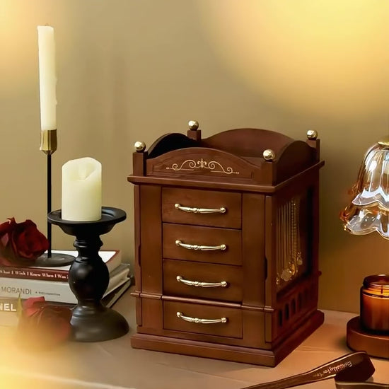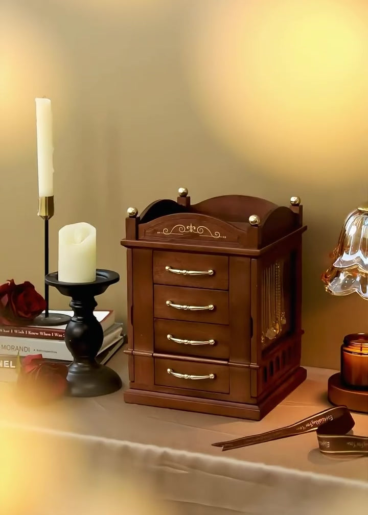 Crafted with rich dark wood tones and accented by elegant gold-finished handles, this organizer features smooth 360-degree rotation, multiple pull-out drawers, hidden compartments, and necklace hooks behind glass doors. Every detail is thoughtfully designed to keep your jewelry visible, protected, and beautifully displayed.